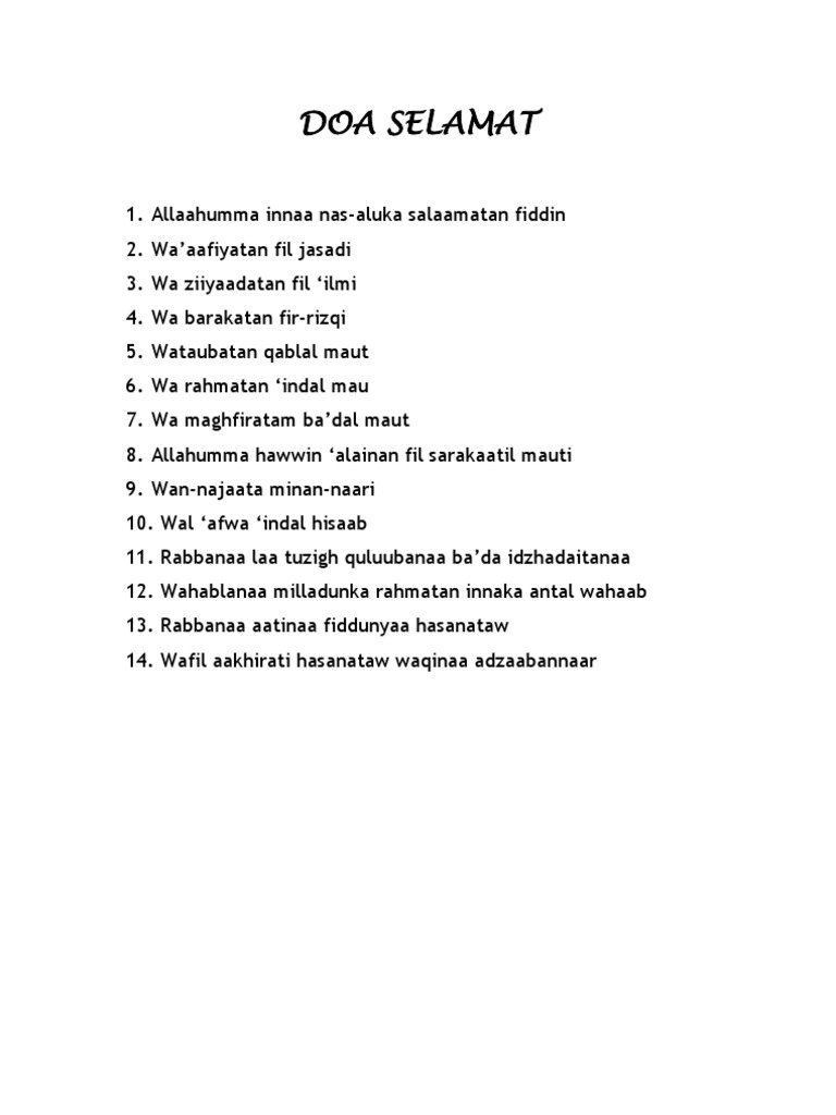 Dan berikut adalah kumpulan doa doa selamat dalam bahasa arab tulisan latin lengkap dengan terjemahannyasilakan anda pelajarai dan hafalkan karena doa ini sangat bagus sekali dan hampir setiap waktu mayoritas orang muslim memanjatkan doa selamat ini. Amalan membaca doa selamat ini boleh juga digunakan di majlis kenduri dan juga majlis keraian di tempat kita.
