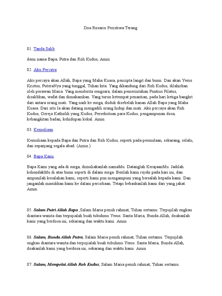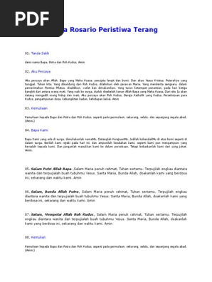 Aku percaya akan allah bapa yang maha kuasa pencipta langit dan bumi. Doa rosario peristiwa terang cahaya tanda salib dalam nama bapa dan putra dan roh kudus aku percaya aku percaya akan allah bapa yang mahakuasa pencipta langit dan. Peristiwa terang doa rosario ditulis oleh yustinus wibowo jika mengutip harap berikan link yang menuju ke artikel peristiwa terang doa rosario ini.