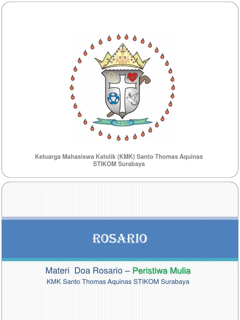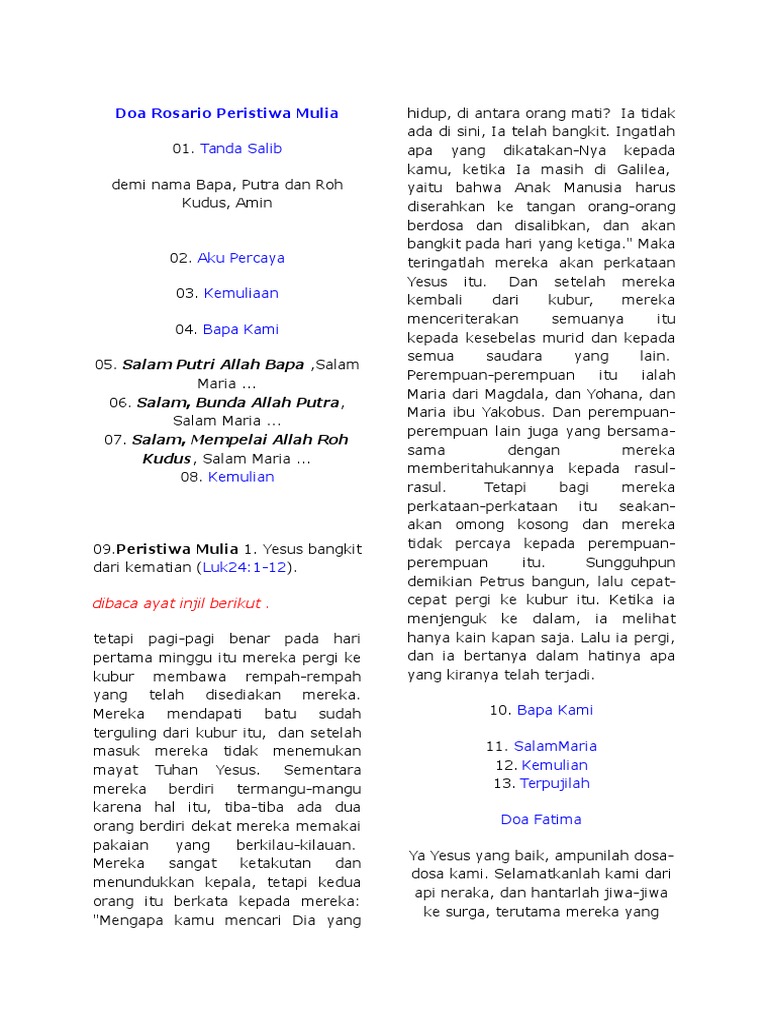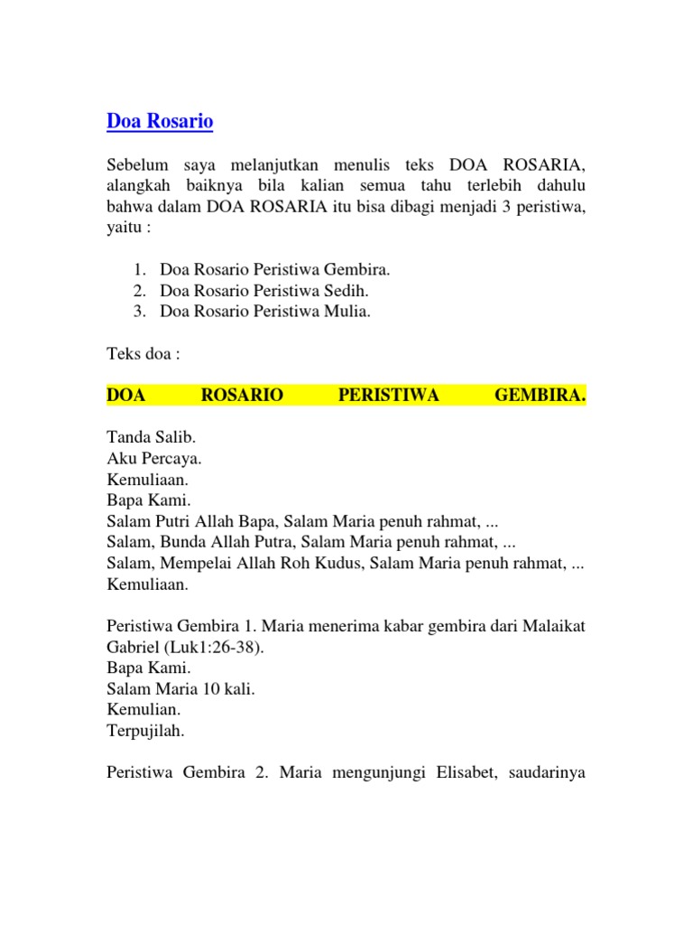 Peristiwa terang doa rosario ditulis oleh yustinus wibowo jika mengutip harap berikan link yang menuju ke artikel peristiwa terang doa rosario ini. Rosario sebenarnya adalah doa renungan atas misteri keselamatan dari saat yesus mulai dikandung sampai ia dimuliakan di surga dan mengutus roh kudus seluruhnya 20 peristiwa. Salam hai engkau yang dikaruniai tuhan menyertai engkau.