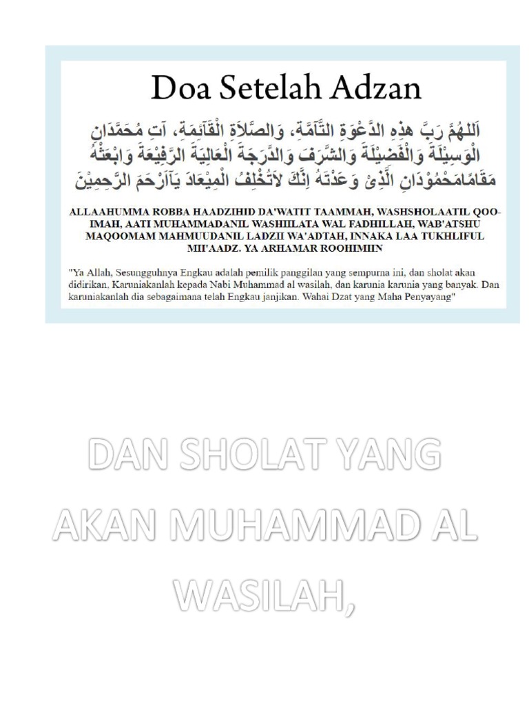 Doa adzan dan setelah adzan. Doa setelah sholat fardhu wajib lengkap dengan terjemahnya demikianlah mengenai bacaan doa sesudah adzan dan iqomah beserta latin dan artinya yang bisa kita amalkan setelah mendengan adzan dan iqomah. Bacaan adzan dan doa setelah adzan shahihdi masa awal islam tidak ada cara umum memanggil manusia untuk melaksanakan shalat dan tidak ada pula cara memanggil muslim untuk mendatangi masjid untuk shalat berjamaah. Panggilan adzan pertama dilakukan oleh bilal bin rabbah salah satu sahabat rasulullah.