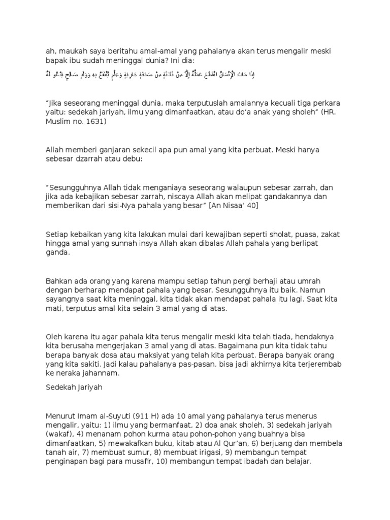 Menurut imam al suyuti 911 h ada 10 amal yang pahalanya terus menerus mengalir yaitu. Memiliki anak yang sholeh dan sholehah tentu menjadi sebuah kebanggaan karena doa anak yang sholeh kepada orang tuanya adalah sebuah amalan yang tidak akan terputus. Jika seorang anak adam meninggal dunia maka putuslah segala amal ibadahnya kecuali tiga perkara sedekah jariyah ilmu yang bermanfaat dan anak anak saleh yang mendoakan kedua orang tuanya.