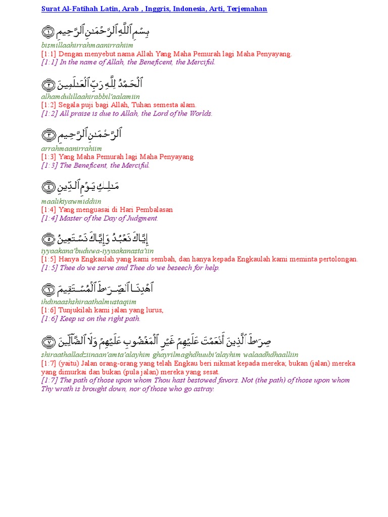 Surat al fatihah latin arab inggris indonesia arti terjemahan surat ke 1 dari al quran yang berisi 7 ayat dan diwahyukan di mekah serta mengandung arti pembukaan preamble. Baca surat al fatihah lengkap dengan bacaan arab latin terjemah indonesia. Doa iftitah doa iftitah merupakan doa yang dibaca setelah takbiratul ihramyaitu pada takbiratul ikhram pertama dalam shalat dan sebelum membaca doa al fatihah.