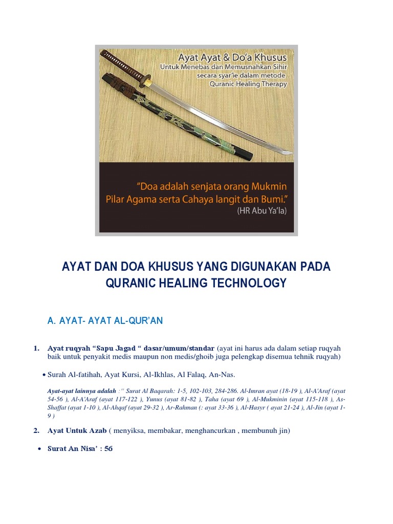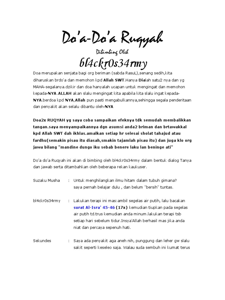 Bacaan ayat ayat ruqyah berserta doa ruqyah dan ruqyah syariyyah ayat ruqyah ruqyah ialah bentuk mufradtunggal yang bentuk jamaknya merupakan ruqa ruqyat dan ruqoyat. Ruqyah sudah ada sejak zaman jahiliyyah. Ayat dan doa ruqyah khusus untuk berbagai keperluantehnik khusus a.