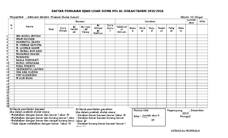 Penilaian Amaliah Vii 3 B Sholat