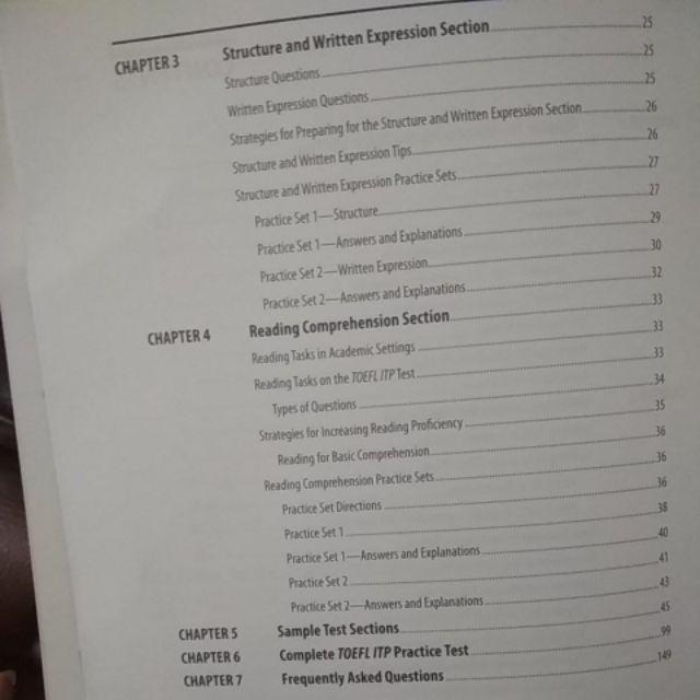Listening comprehension structure and written expression dan reading comprehension. Pada dasarnya dari keseluruhan soal yang diujikan pada tes toefl bagian toefl structure adalah bagian yang paling sulit meskipun jumlah soalnya adalah yang paling sedikit diantara bagian soal listening maupun reading karena sesi ini dalam toefl itp menguji kemampuan para peserta dalam bidang grammar tata bahasa bahasa inggris english. Setiap soal bernilai 5 poin dengan alokasi waktu 20 menit dalam setiap sesinya.