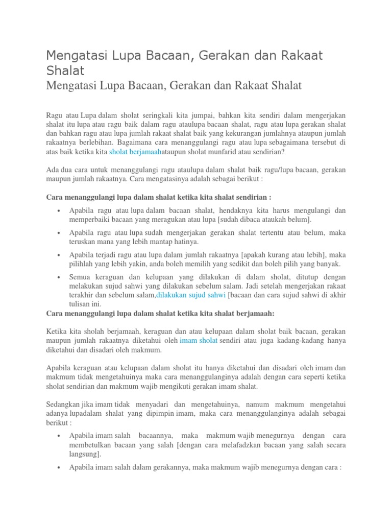 Jika kita lupa tidak sujud misalkan dan ingat ketika belum memulai membaca al fatihah di rakaat berikutnya maka hendaknya kita melakukan sujud dulu. Kita tak akan terlepas dari sifat lupa atau leka walaupun ketika beribadah kepadanya. Ragu atau lupa dalam sholat seringkali kita jumpai bahkan kita sendiri dalam mengerjakan shalat itu lupa atau ragu baik dalam ragu atau lupa bacaan shalat ragu atau lupa gerakan shalat dan bahkan ragu atau lupa jumlah rakaat shalat baik yang kekurangan jumlahnya ataupun jumlah rakaatnya berlebihan.