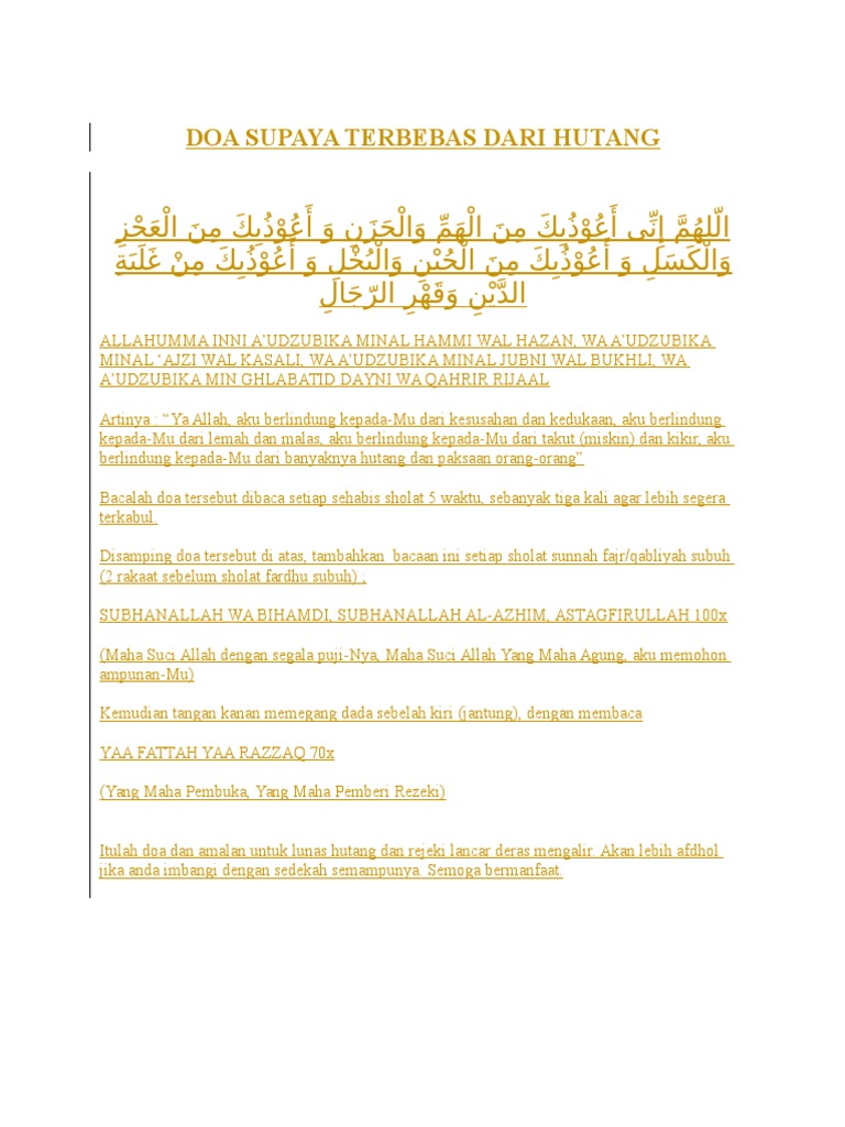 Semoga senantiasa allah melimpahkan rezeki yang melimpah rezeki yang halal kepada anda aamin. Semoga bermanfaat semoga terbebas dari hutang sudah sifatnya manusia adalah tergesa gesa. Ada wirid doa yang berasal dari ayat al quran yang diajarkan oleh rasulullah saw untuk tujuan melunasi hutang dan meluaskan rezekidalam sebuah riwayat diceritakan bahwa rasulullah saw menegur sahabat muaz bin jabal.