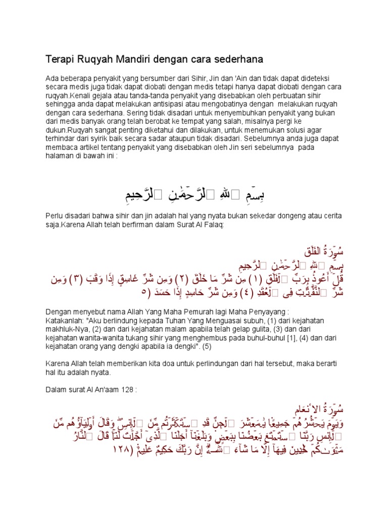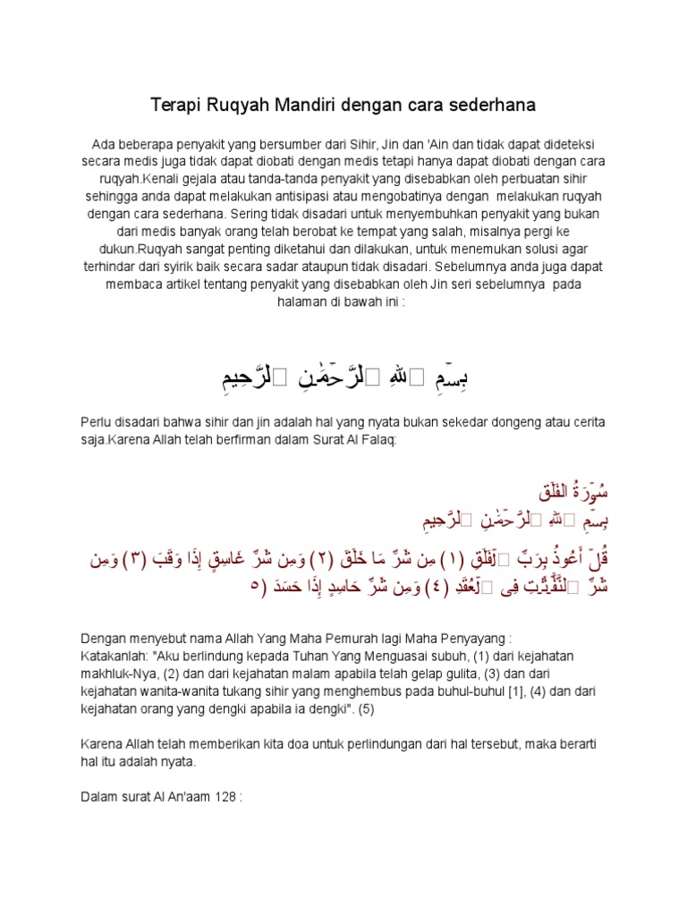 Doa ruqyah mandiri. Definisi ruqyah secara istilah adalah berlindung diri dengan ayat ayat al quran dan dzikir dzikir serta doa doa yang diajarkan oleh nabi saw ibn al athir. Nabi ayyub menjadi sangat menderita di masa lalu dan melalui. Cara ruqyah mandiri diri sendiri cobalah lakukan ruqyah mandiri jika sering emosional malas beribadah malas interaksi dengan istrisuami sering bertengkar anak terlalu nakal dirumah selalu gelisah rumah yang tidak nyaman dll.