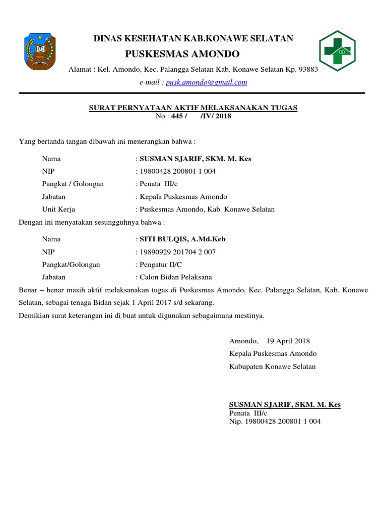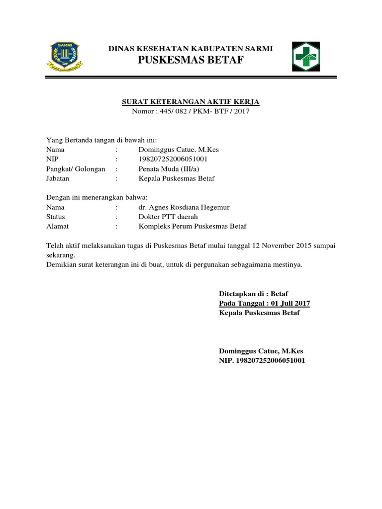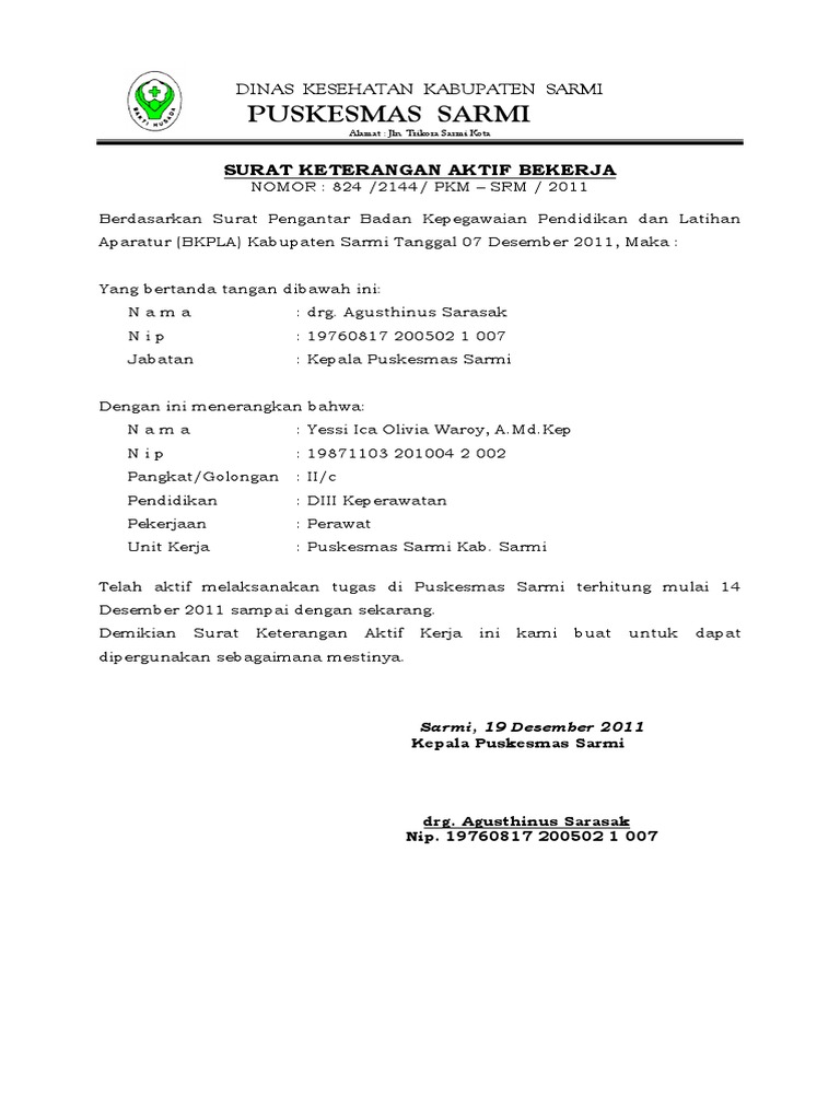 Contoh Surat Keterangan Aktif Kerja Di Puskesmas - 16 Contoh Surat Pengalaman Kerja Bidan Dari Perusahaan Guru Contoh Surat : Surat keterangan kerja dibuat untuk memberikan penjelasan atau memberikan informasi bahwa pernah bekerja.. Biaya membuat surat kesehatan dipuskesmas. Surat keterangan ini sekilas hampir mirip dengan surat pernyataan, namun sejatinya ke dua surat tersebut adalah surat yang berbeda. Untuk lebih jelasnya mengenai contoh surat. Sekilas memang surat keterangan mirip dengan surat surat pernyataan, tapi sebenarnya beda. Contoh surat keputusan pengangkatan karyawan kontrak.